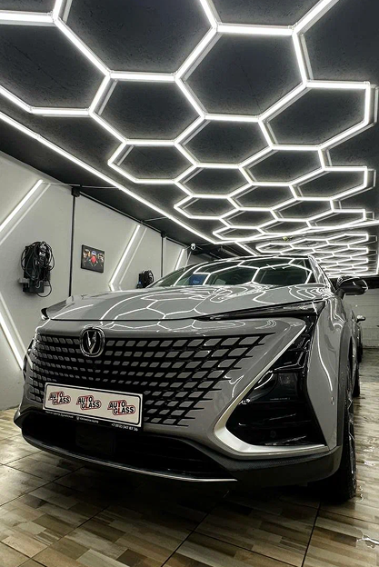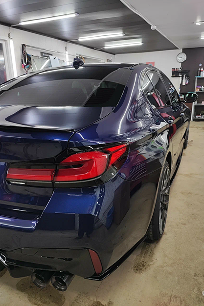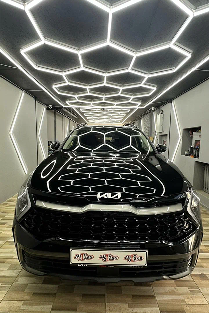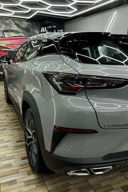 Затем проведена двухэтапная машинная полировка — сначала абразивная, затем финишная, после чего удалены остатки полировочных паст. Для защиты кузова нанесён керамический состав, а пластиковые элементы и фары дополнительно отполированы и обработаны. В завершение проведена финальная проверка качества выполненных работ.